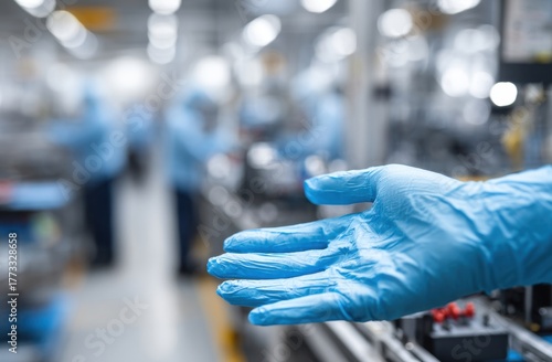 A close-up view shows a hand wearing a blue glove, highlighting the importance of safety protocols in the workplace.