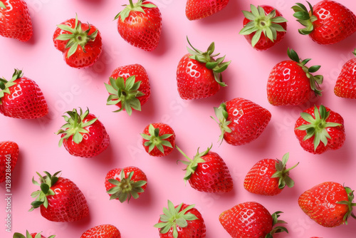 A cluster of fresh, juicy strawberries with vibrant green leaves, arranged on a pink background.