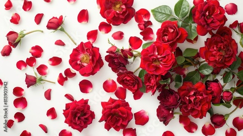 A cluster of vibrant red roses in full bloom surrounded by a blanket of delicate crimson petals set against a clean white backdrop