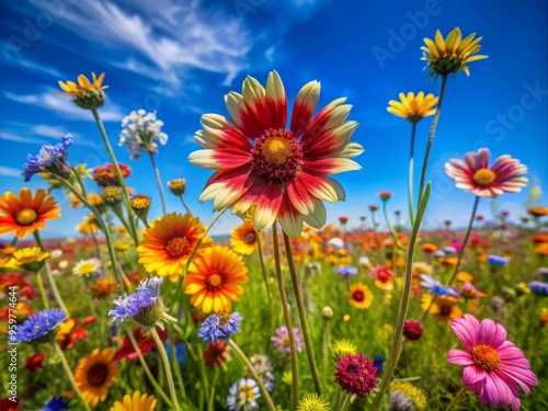 A cluster of wildflowers blooms in a field, their colors vibrant against the soft blue sky, with a macro lens capturing the intricate details of the petals and stamens.