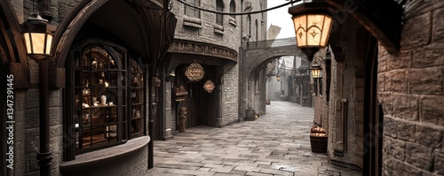 A cobblestone street lined with historic buildings, lanterns illuminating the path, creating a mysterious and enchanting atmosphere.