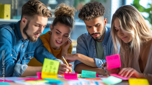 A collaborative team of four deep in discussion over sticky notes during a brainstorming session