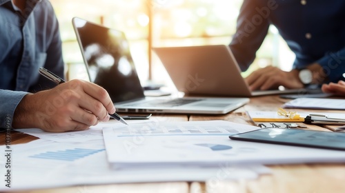 A collaborative workspace featuring hands engaged in note-taking, with laptops and documents on a table, symbolizing teamwork and productivity.