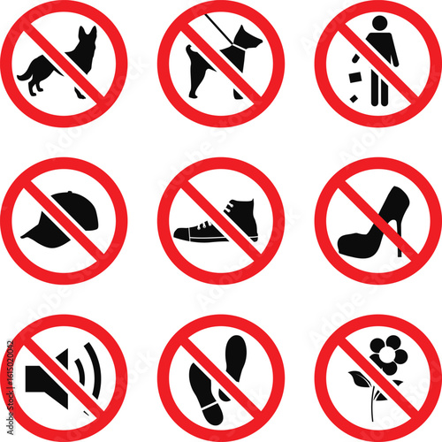 A collage of various "prohibited" symbols, including dogs, littering, headwear, footwear, and noise.