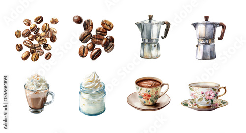 A collection of coffee-related items, showcasing coffee beans, espresso makers, whipped cream, hot chocolate, and elegant teacups