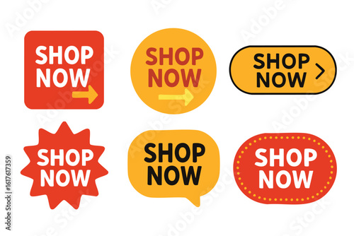 A collection of colorful and eye-catching shop now buttons in various shapes and styles, perfect for e-commerce websites and online advertising campaigns to encourage purchases.
