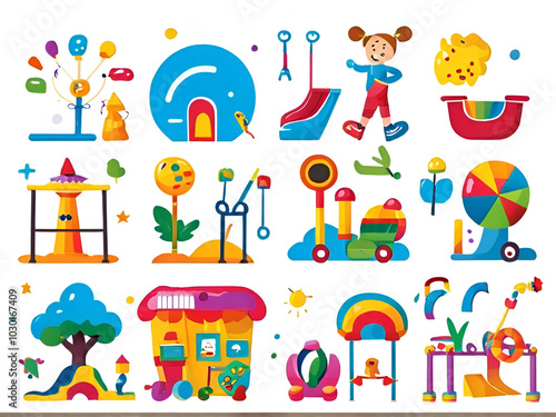 A collection of colorful toys and objects, highlighting a playful and imaginative atmosphere.