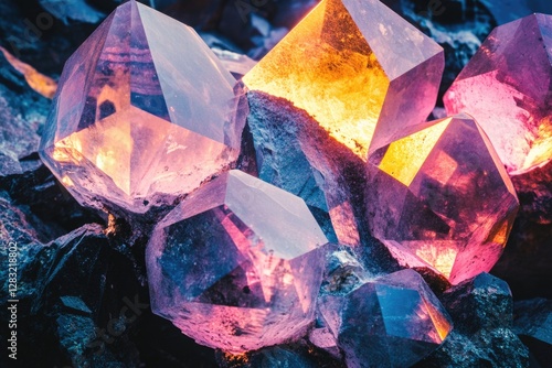 A collection of crystals rests atop a stack of rocks, suitable for use in decorative or scientific contexts