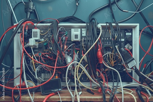 A collection of electrical cables and wires arranged on a flat surface, with various colors and textures visible