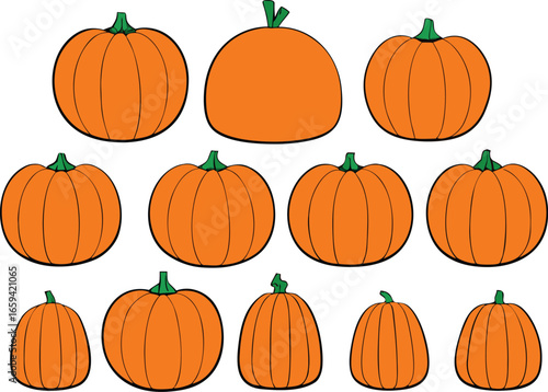A Collection of Eleven Orange Pumpkins with Green Stems on a White Background