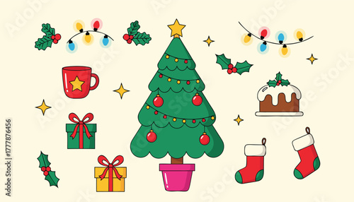 A collection of festive christmas elements including a decorated tree, gifts, stockings, a mug, cake, and holly with lights