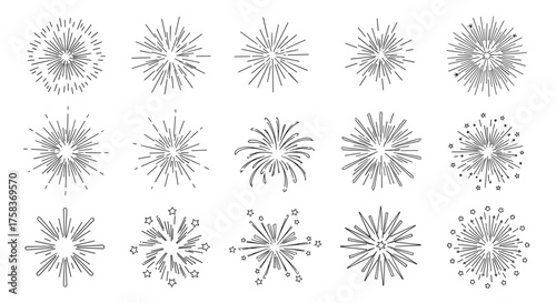 A collection of fifteen stylized starbursts and sunbursts in various abstract geometric patterns.