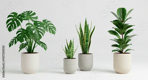 A collection of four potted plants including monstera and snake plants against a white background