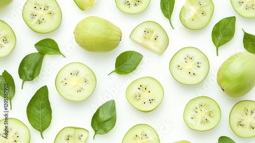 A collection of green fruits with vibrant leaves displayed on a clean white surface, showcasing their natural beauty and freshness.