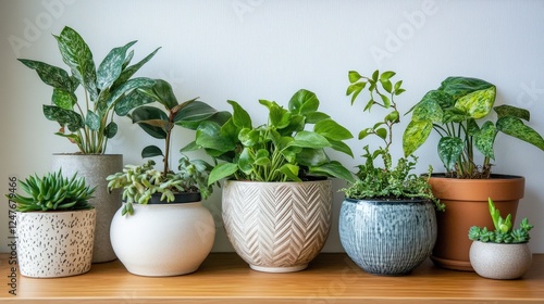 A collection of houseplants in various decorative pots
