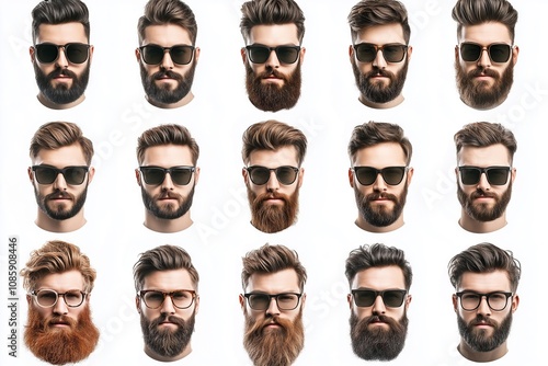 A collection of men with different styles of beards and glasses. Concept of variety and individuality, showcasing the different ways men can express themselves through their appearance