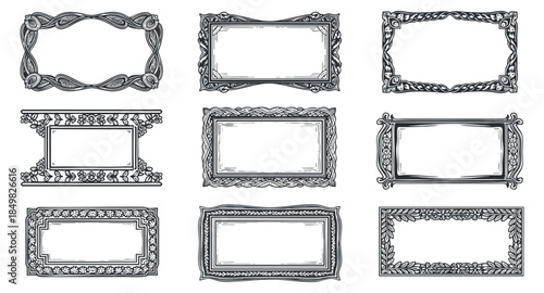 A collection of ornate decorative frames in black and white vector style, suitable for invitations and graphic design projects