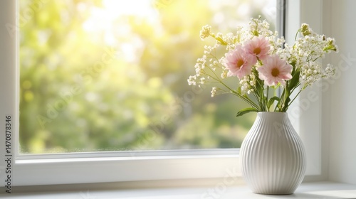 A collection of pink flowers and white blossoms in a white vase rests on a windowsill as warm sunlight brightens the serene space