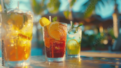 A collection of refreshing soda beverages in tall glasses with ice and lemon wedges on a table by the beach. Perfect for a sunny day.