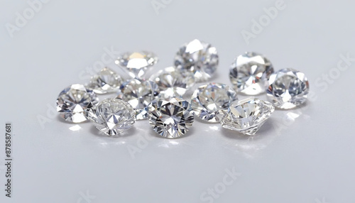A collection of round cut diamonds are scattered on a white surface, reflecting light and showcasing their brilliance