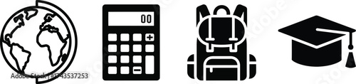 A collection of school related icons including a globe calculator backpack and graduation cap icon set