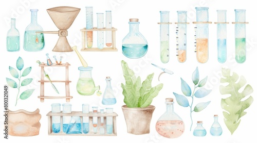 A collection of scientific equipment and plants. Scene is scientific and natural. The idea behind the image is to showcase the beauty of science and nature. Watercolor painting style.
