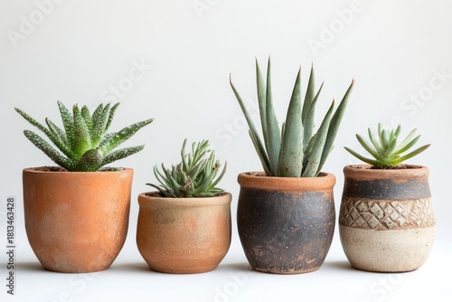 A collection of small terracotta pots with various succulents planted inside them, arranged on a white surface.