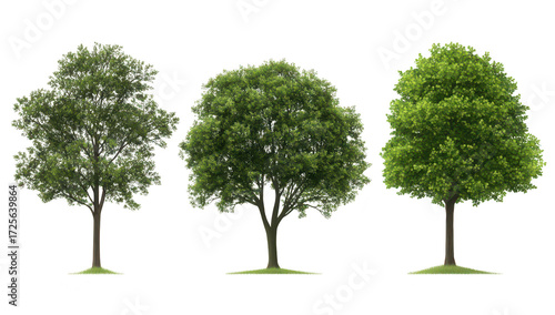 A collection of three distinct trees varying shades of green foliage. symbolizing the beauty of nature and the changing seasons. suitable for environmental themes and educational materials