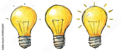 A collection of three hand-drawn light bulbs, showcasing different brightness levels, set against a transparent background, perfect for creative projects or educational materials