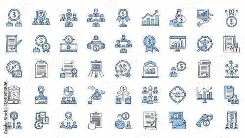 A collection of various blue and gray business-related icons on a white background with a mix of people, objects, and symbols.