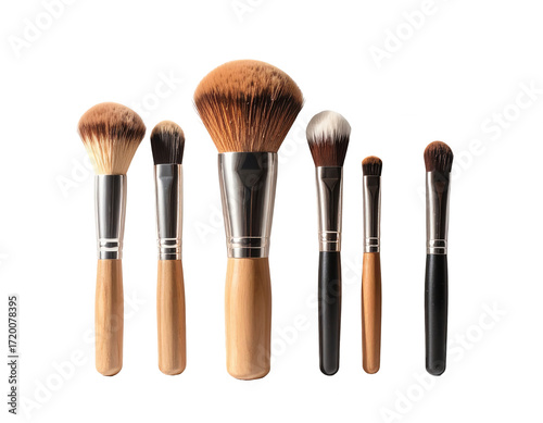 A collection of various makeup brushes, displayed against a black backdrop, showcasing diverse sizes and bristle textures.