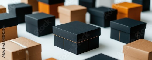 A collection of various small gift boxes in different colors, prominently featuring black and brown boxes, arranged aesthetically on a white surface.