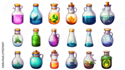 A collection of vibrant, cartoon-styled potion bottles in various colors and bubbling contents, corked and uncorked. Game design assets, transparent background