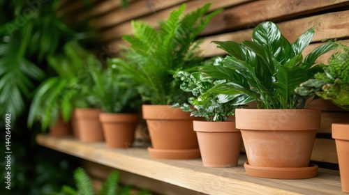 A collection of vibrant green houseplants displayed in terracotta pots on wooden shelves, creating a cozy and refreshing indoor garden atmosphere in a stylish home.