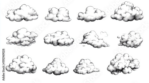 A collection of vintagestyle handdrawn clouds isolated on a white background Retro and cartooninspired design elements in vector format