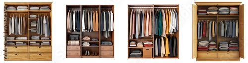 A collection of wooden wardrobes with organized clothing isolated on a transparent background