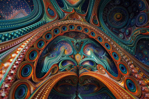 A colorful abstract painting of a tree with many eyes