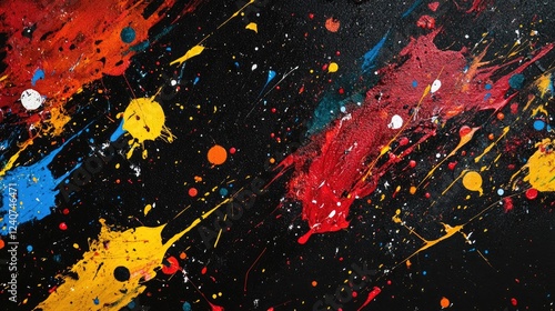 A colorful and abstract display of paint splashes in vivid hues, captured in high detail on a black studio floor for a dynamic visual.