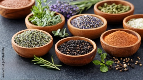 A colorful array of spices and herbs displayed in wooden bowls on a dark surface