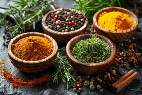 A Colorful Array of Spices and Herbs in Wooden Bowls