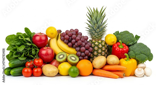 A colorful assortment of fresh fruits and vegetables arranged on a white surface in a studio setting