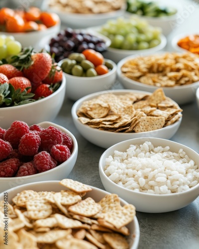 A colorful assortment of fruits and snacks arranged in bowls for a healthy spread.