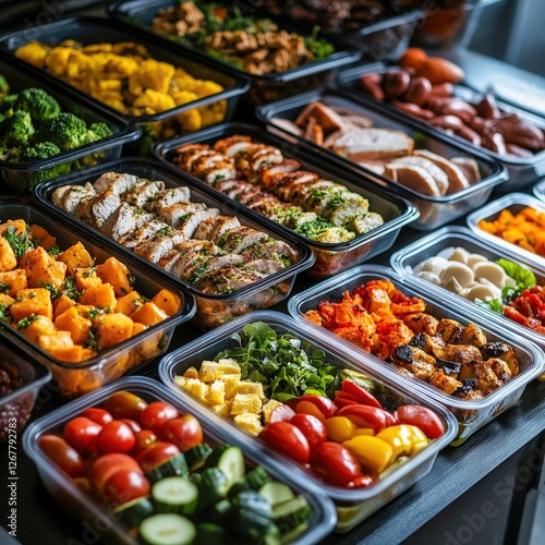A colorful assortment of healthy meal prep containers filled with various vegetables, proteins, and grains, showcasing a balanced diet.