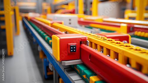 A colorful, automated conveyor system in a modern industrial facility, highlighting efficient production and advanced technology.