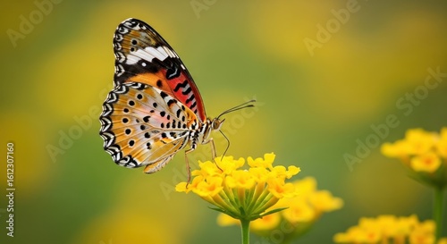 A colorful butterfly rests on a vibrant yellow flower in a garden setting