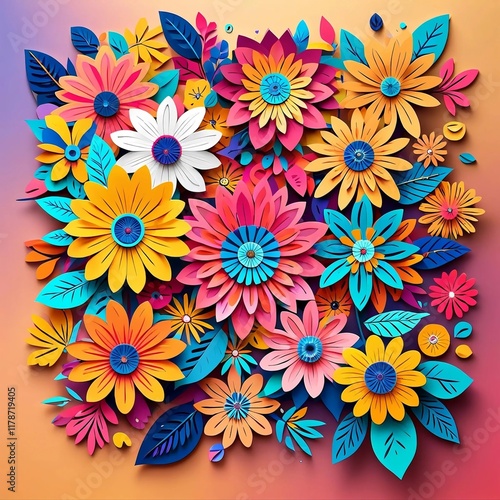 A colorful collage of flowers made out of paper. The flowers are arranged in a way that creates a sense of movement and energy