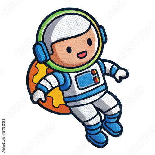 A colorful embroidered patch of a cute astronaut floating in space with a tiny Earth in the background