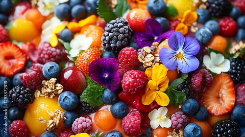 A colorful fruit smoothie bowl topped with berries, granola, and edible flowers.