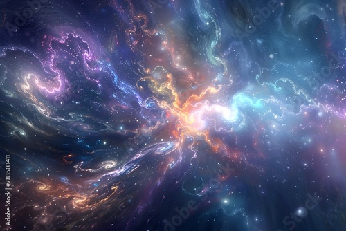 A colorful galaxy with a bright orange star in the center. The stars are scattered throughout the galaxy, with some closer together and others further apart