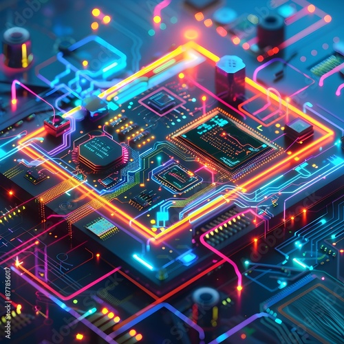 A colorful, glowing circuit board featuring illuminated microchips, neon pathways, and intricate connections, highlighting advanced and futuristic electronics design.